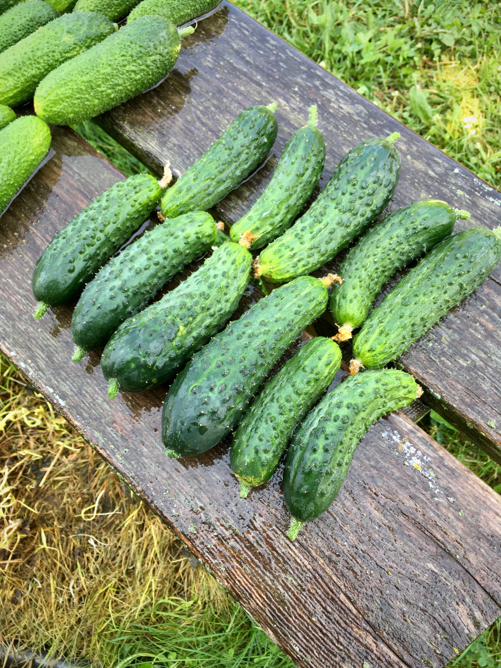 Excelsior: typically harvested at 4-5" in length. American style spines, blocky with excellent flavor. Tom's preferred cucumber for making sliced pickles, especially bread and butter style.